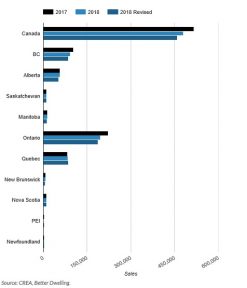 The largest ratio of sales expected to decline is in British Columbia. CREA is forecasting 85,400 sales in 2018, a 17.7% decline from last year. In 2019 they expect sales to increase to 88,200, a 3.3% increase from this year’s forecast. Sales in 2019 are still expected to be 14.99% lower than 2019 sales.