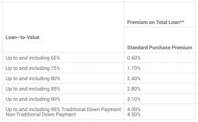 The amount of mortgage insurance you pay depends on how much you put down. The price ranges from 2.8 percent to 4 percent (the maximum fee, if you’re putting down the minimum downpayment of 5 percent). To calculate it, first figure out what percentage your downpayment is and match it to the appropriate insurance premium rate. Then you subtract your downpayment from the purchase price and apply the insurance premium to the remaining principal.