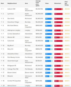 Its study, which covers 252 neighbourhoods across the region, examined the current average home price in each neighbourhood, how that price compares with both the surrounding area and the region as a whole (“value”), how much the average price has increased over the past year and five years (“momentum”), and what local realtors had to say about the area’s potential. It then created a star rating for each neighbourhood and ranked them.