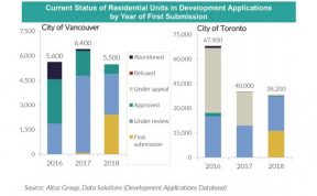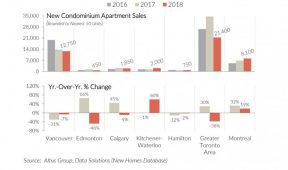 Across Canada, new condo sales totalled just over 48,500 units in 2018, down 21% from the almost 62,000 sales in 2017. The Greater Toronto Area accounted for nearly half of all 2018’s new condo sales in the major cities covered by Altus Group’s survey.