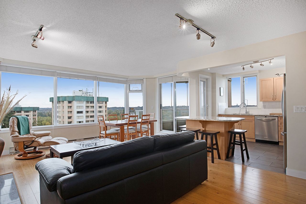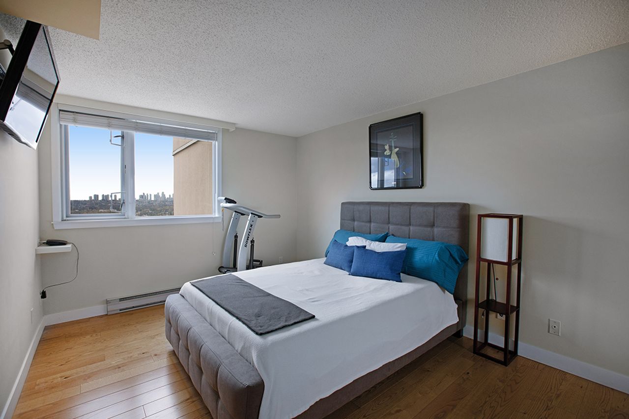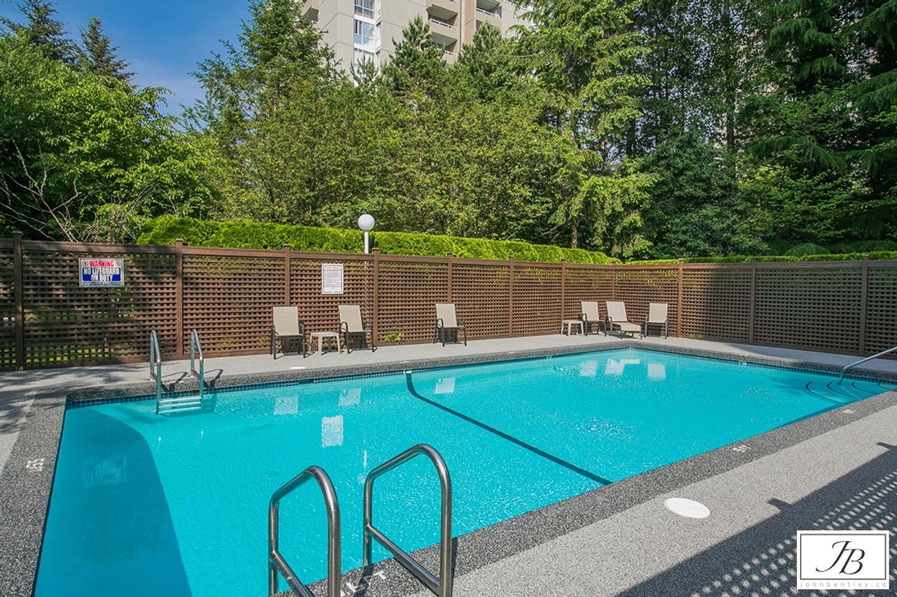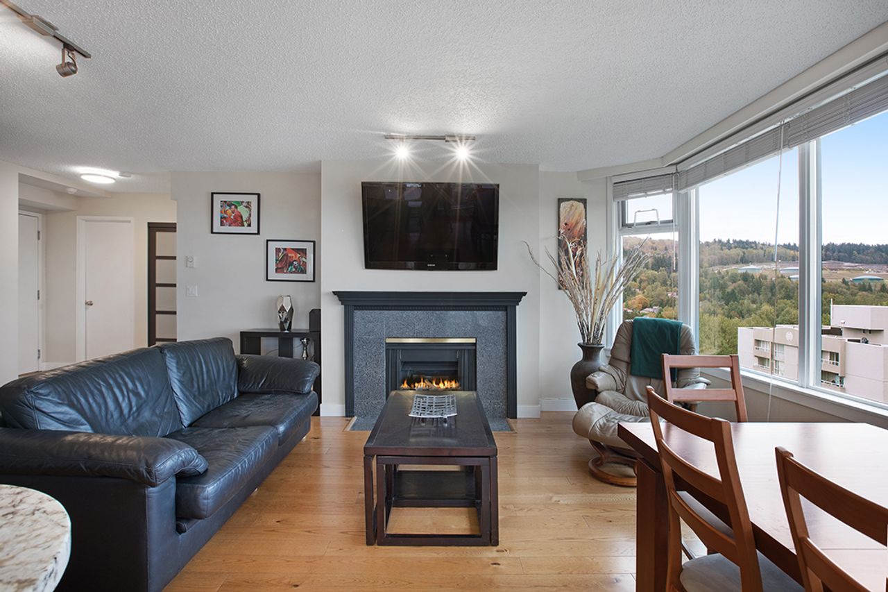 Welcome to The Ambassador – Bright and Spacious 1017 sqft, 2 bdrm corner unit, features SE exposure, over-sized picture windows, open and airy layout, gas fireplace, engineered flooring throughout, updated kitchen with SS appliances, granite countertop and island. Generous sized bdrms on opposite sides of the living area to enhance privacy, includes large master with updated ensuite, closet organizers and 2nd bdrm makes a perfect home office too. Covered balcony captures views of city and beyond. In-suite laundry, secured underground parking + storage locker. On-site caretaker, fully- equipped gym, rec room and outdoor pool. Proactive strata mgmt, rainscreened building has numerous upgrades : re-pipe (2005), exterior painting (2005), elevator (2010), state-of-art fire panel (2017), boilers (2017), exterior and underground parking lighting (2017), new carpet and painting in hallways (2018), intercom system upgrade (2018), underground parking painting (2019), fitness equipment upgrade (2019), car wash bay re-surfaced (2020), parking garage gate (2020), storage locker lightings (2021), access card readers and fobs (2022) and backup generator (2022). Most desirable location, convenient transit/skytrain/highway options, close to schools, SFU, shopping, trails and golf course.