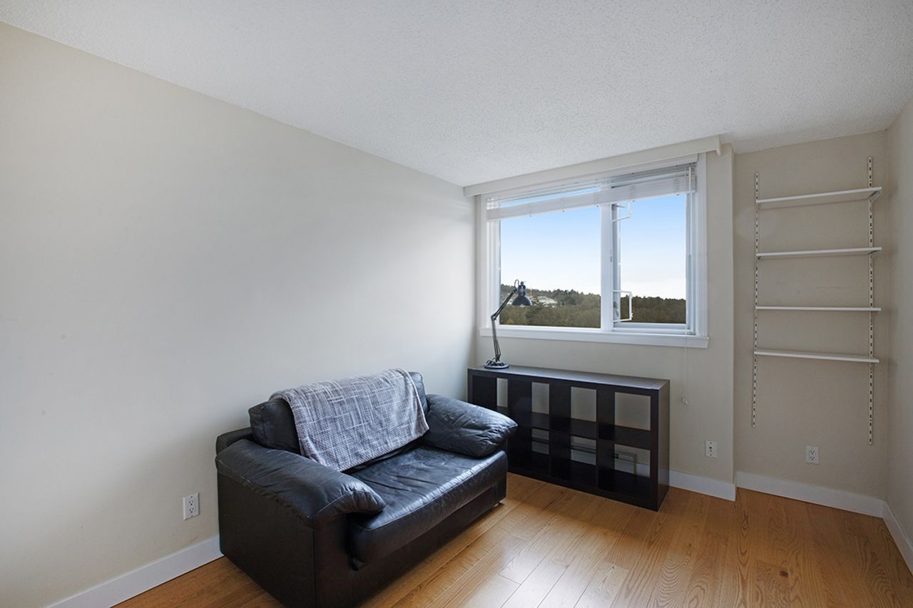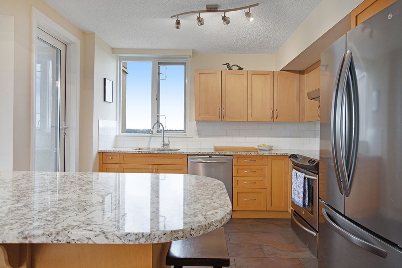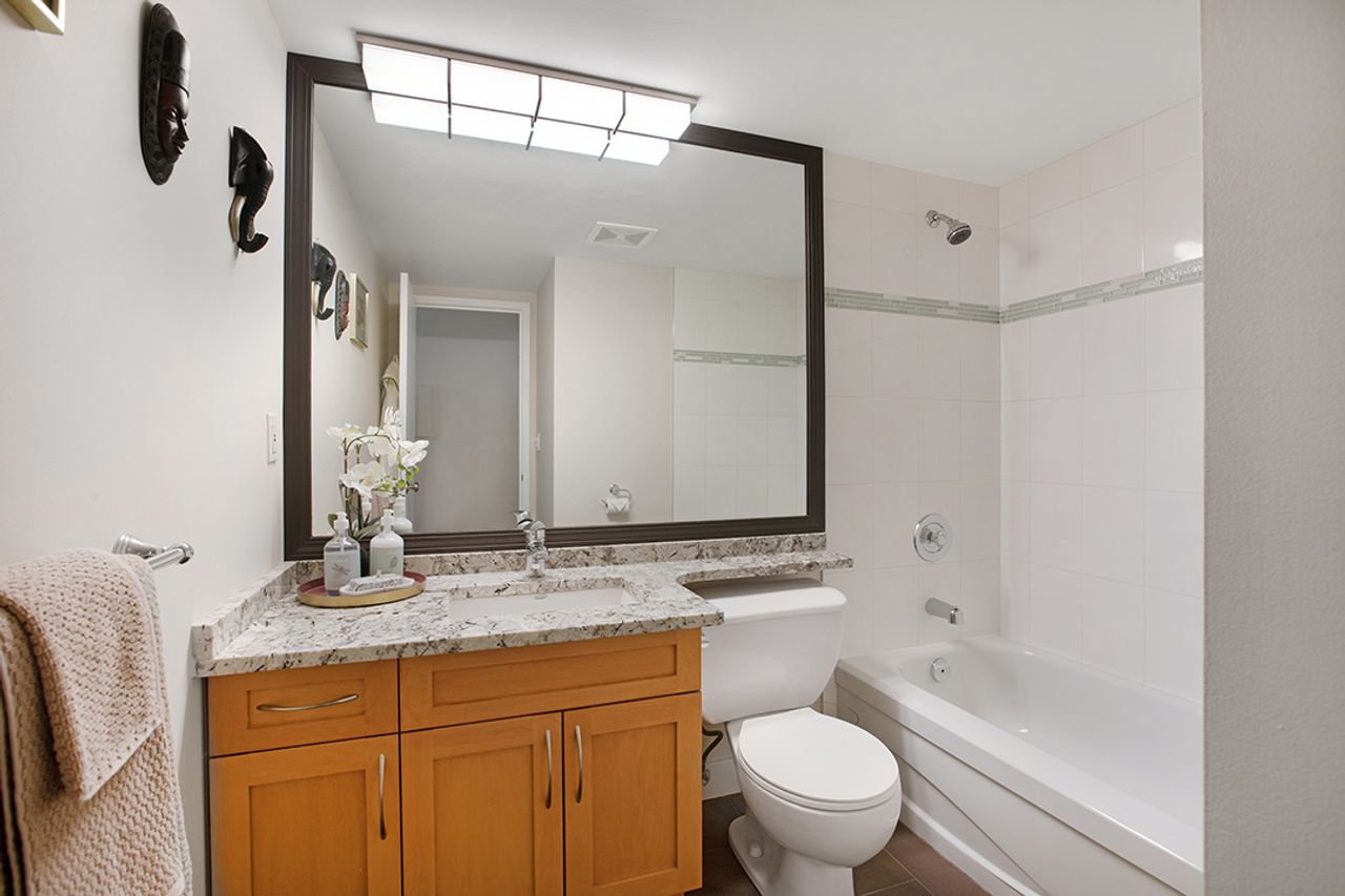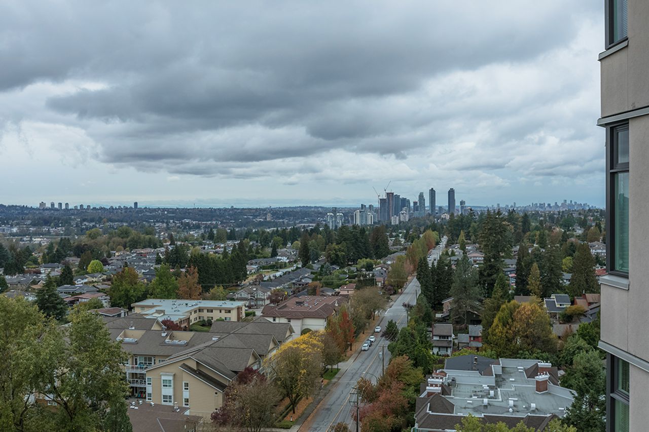 Welcome to The Ambassador – Bright and Spacious 1017 sqft, 2 bdrm corner unit, features SE exposure, over-sized picture windows, open and airy layout, gas fireplace, engineered flooring throughout, updated kitchen with SS appliances, granite countertop and island. Generous sized bdrms on opposite sides of the living area to enhance privacy, includes large master with updated ensuite, closet organizers and 2nd bdrm makes a perfect home office too. Covered balcony captures views of city and beyond. In-suite laundry, secured underground parking + storage locker. On-site caretaker, fully- equipped gym, rec room and outdoor pool. Proactive strata mgmt, rainscreened building has numerous upgrades : re-pipe (2005), exterior painting (2005), elevator (2010), state-of-art fire panel (2017), boilers (2017), exterior and underground parking lighting (2017), new carpet and painting in hallways (2018), intercom system upgrade (2018), underground parking painting (2019), fitness equipment upgrade (2019), car wash bay re-surfaced (2020), parking garage gate (2020), storage locker lightings (2021), access card readers and fobs (2022) and backup generator (2022). Most desirable location, convenient transit/skytrain/highway options, close to schools, SFU, shopping, trails and golf course.
