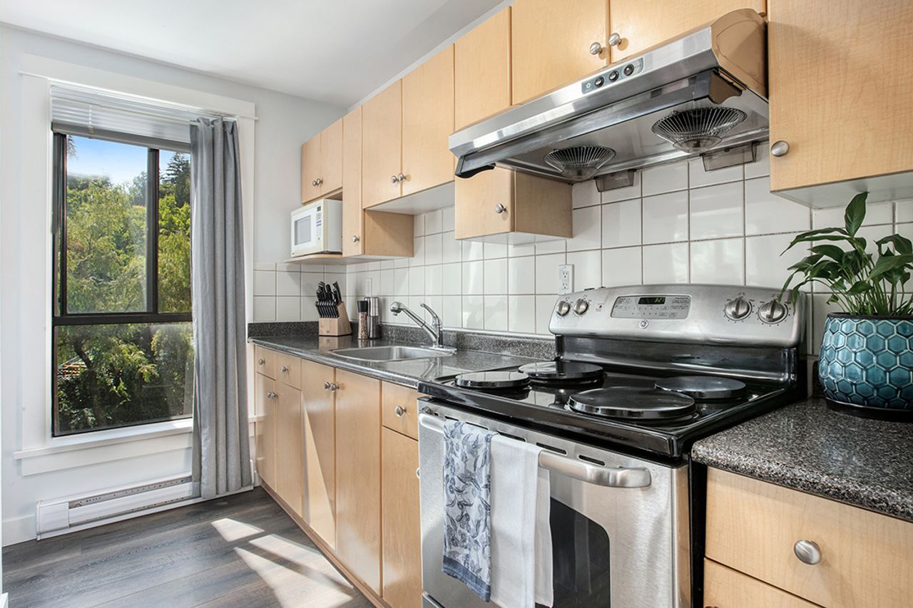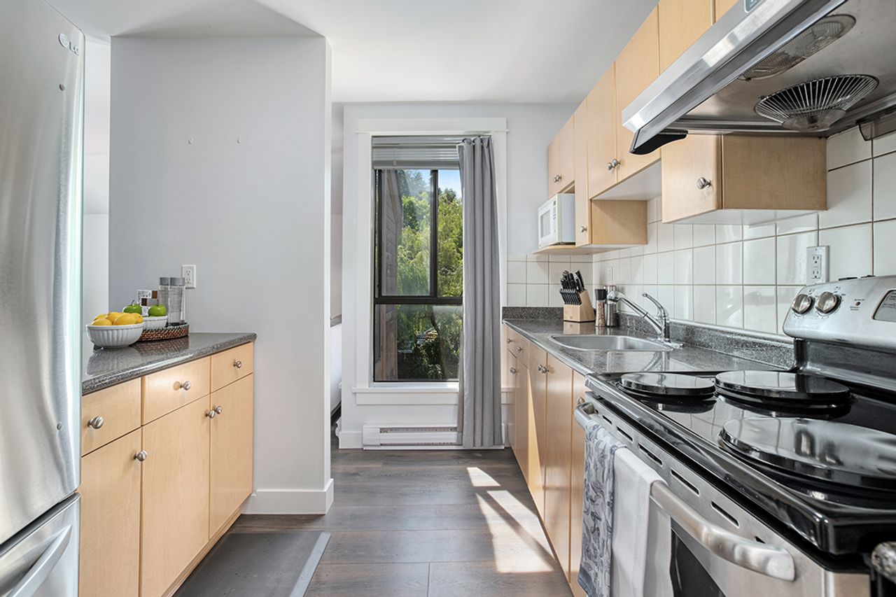 Welcome to The Mountain Wood Complex – nestled in a park-like setting with lush greenery, hiking/biking trails and onsite amenities. A family-oriented neighbourhood with endless recreation and social opportunities. Well-kept TOP floor, 845 sqft corner unit offers functional layout, extensive updates throughout, SS appliances, modern kitchen opens up to a breakfast bar and adjacent living/dining area, in-suite laundry and ample storage, spacious open air sundeck for entertaining. 2 pets (no size restrictions) and rentals are allowed. Roof (2021), deck (2024), pool (2025). Amazing location that balances between city and nature. Stoney Creek Elementary, Burnaby Mountain Secondary, SFU, community garden, new (under construction) Cameron rec, transit, skytrain and convenient Lougheed Town Center shopping nearby. Your journey to a home starts here!