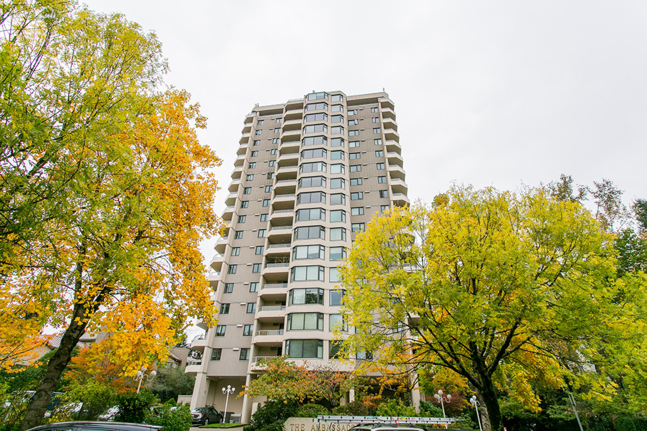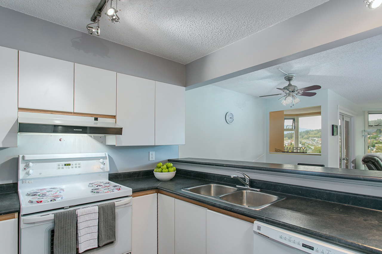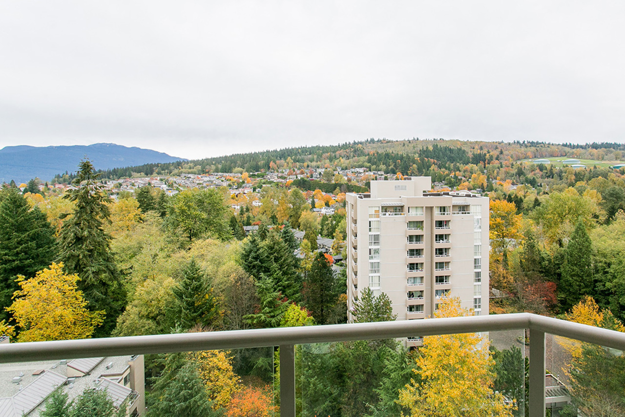 Welcome to The Ambassador - bright and spacious 942sqft 2 bdrm N-facing unit with unobstructed mountain views. Living room features electric fireplace, bay window seat, enjoy the natural displays of 4-season's color from your oversized windows. French doors opens to office | den or 2nd bdrm (with closet). Kitchen and adjoining dining area. Great size master bdrm with ensuite, covered balcony, in-suite laundry, parking + locker. Building offers proactive strata mgmt., brand new fire panel, on-site caretaker, gym, rec room and outdoor swimming pool. Close to major routes, mins to transit, skytrain, schools, SFU, shopping, trails and golf course. This functional home is all about convenience and your new phase of life.